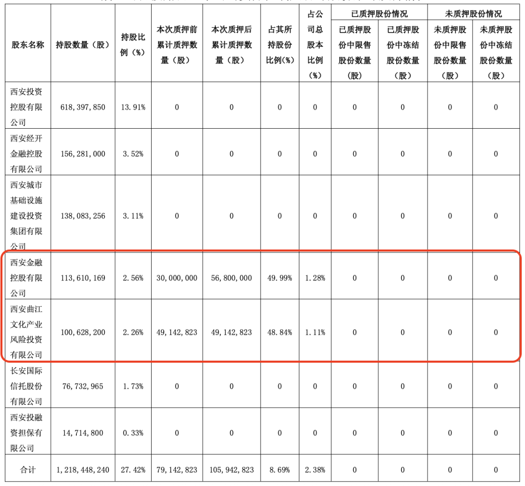 另外,除西安金控,目前西安银行另一实控人关联股东西安曲江文化产业风险投资有限公司质押比例为48.84%,也已接近50%。