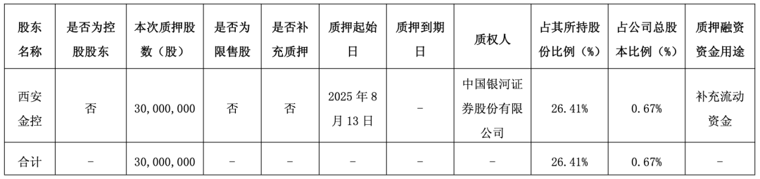 值得一提的是,就在8月13日,西安金控将其持有公司3000万股股份进行了质押,质押融资资金用途同样为补充流动资金,质权人为中国银河证券股份有限公司。