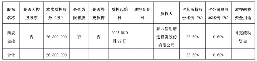 西安金控本次质押股份后,累计质押公司股份5680万股,占其持有公司股份的49.99%,占公司股份总数的1.28%。